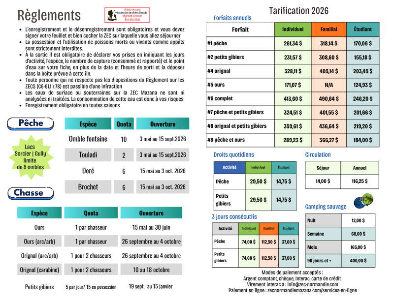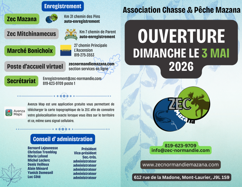 Les ZEC Normandie et Mazana, c'est plus de 1750 km2 en superficie de territoire, plus de 400 points d'eau dont fait partie le lac Bazinet (joyau de la ZEC Normandie), 5 campings aménagés annuels, l'endroit parfait pour tous les chasseurs, les pêcheurs, les quadistes, les cueilleurs et tous les autres passionnés de nature.